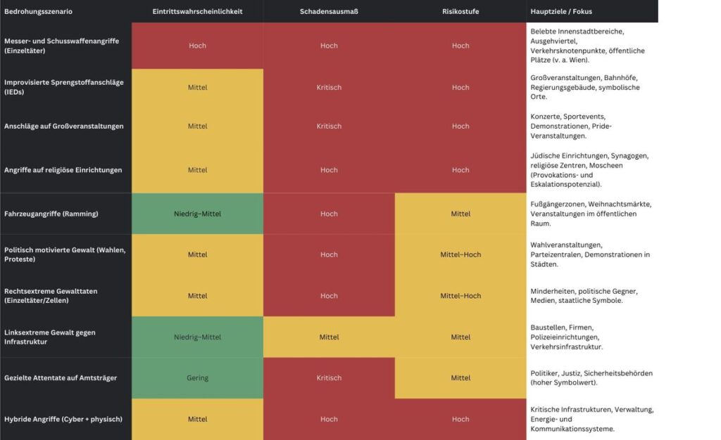 Besonders exponiert sind sogenannte „weiche Ziele“ in urbanen Räumen. Dazu zählen belebte Ausgehviertel, Fußgängerzonen, Großveranstaltungen, Verkehrsknotenpunkte sowie religiöse Einrichtungen, insbesondere jüdische Objekte. Der Wiener Anschlag von 2020 verdeutlichte exemplarisch, wie stark Symbolik, hohe Personendichte und mediale Aufmerksamkeit die Zielwahl beeinflussen. Ergänzend rücken zunehmend kritische Infrastrukturen in den Fokus moderner Bedrohungsszenarien. Die Sicherheitsstrategie 2024 hebt explizit Risiken für Energie-, Verkehrs-, Kommunikations- und digitale Systeme hervor, wobei physische Angriffe, Cyberoperationen und Desinformation zunehmend miteinander verschränkt auftreten.