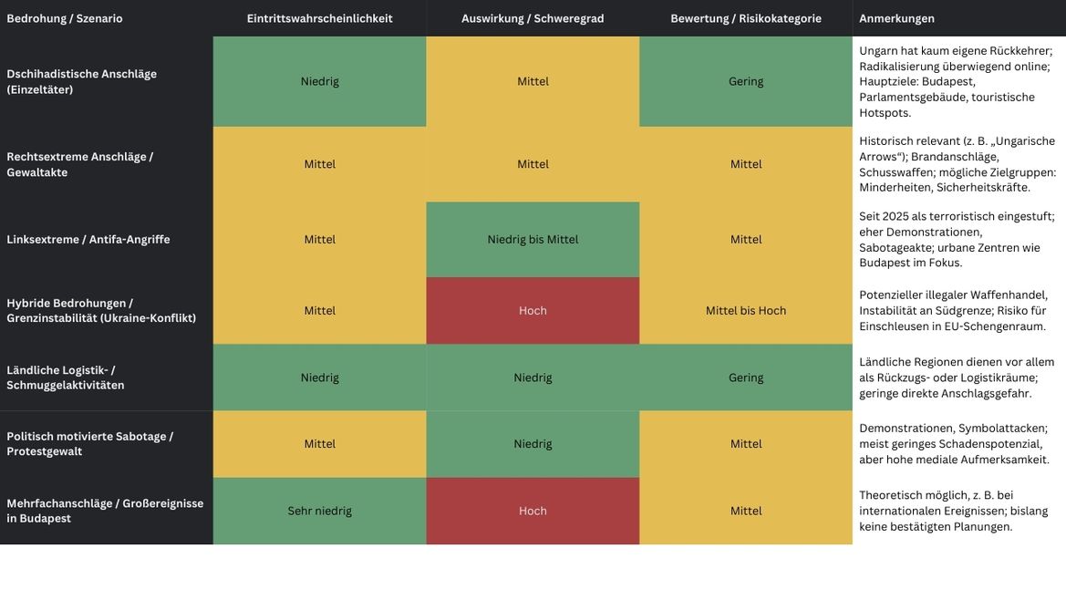Die wahrscheinlichsten Anschlagsarten sind niedrigschwellige Attacken durch Einzeltäter, etwa mit Messern oder Fahrzeugen, politisch motivierte Sabotageakte sowie gewaltsame Ausschreitungen bei Demonstrationen. Historisch zeigten Ereignisse wie die rechtsextreme Anschlagsserie der „Ungarischen Arrows National Liberation Army“ oder Brand- und Schusswaffenattacken auf Roma und politische Gegner, dass Gewalt durch extremistische Akteure auch in Ungarn eine reale Bedrohung darstellt. Der Nagelbombenanschlag am Oktogon in Budapest 2016 verdeutlicht, dass Täter sowohl terroristische Taktiken als auch kriminelle Motive verbinden können. Der Terrorismusindex bewertet Ungarn seit Jahren mit 0 Punkten, was die Abwesenheit regelmäßig auftretender Anschläge widerspiegelt, jedoch seltene, potenziell schwere Ereignisse nicht ausschließt.