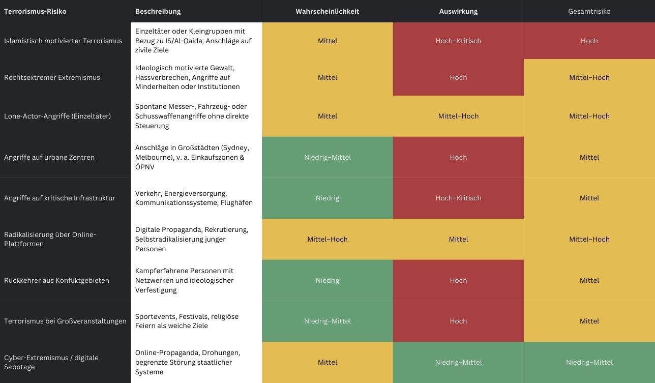 Die australische Regierung stuft die gegenwärtige terroristische Bedrohungslage mit dem Warnlevel „PROBABLE“ ein, was der dritten Stufe des fünfstufigen nationalen Terrorwarnsystems entspricht. Diese Einstufung impliziert eine mehr als 50-prozentige Wahrscheinlichkeit, dass innerhalb der kommenden zwölf Monate ein terroristischer Anschlag verübt oder zumindest konkret vorbereitet wird. Damit bewegt sich Australien in einem sicherheitspolitischen Umfeld erhöhter, jedoch noch kontrollierbarer Gefährdung, das eine dauerhafte Wachsamkeit der Sicherheitsbehörden erforderlich macht.