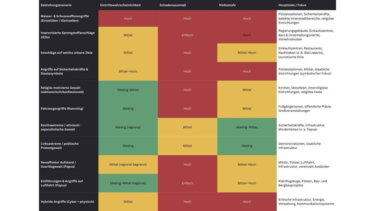 In ländlichen Gebieten der Hauptinseln ist das Risiko großflächiger Anschläge geringer, jedoch spielen diese Regionen eine wichtige Rolle als Rückzugs-, Rekrutierungs- und Logistikräume. Besonders Zentralsulawesi (Poso) und die Molukken waren historisch von religiös-ethnischen Spannungen geprägt, die punktuell mit terroristischen Aktivitäten verschmolzen. In Papua ist die Lage nochmals anders gelagert: Dort richten sich Angriffe primär gegen Sicherheitskräfte, staatliche Infrastruktur und die zivile Luftfahrt. Angriffe auf Hubschrauber, Flugplätze oder Piloten – von denen auch Ausländer betroffen sein können – verdeutlichen die sicherheitsrelevante Sonderstellung dieser Region.