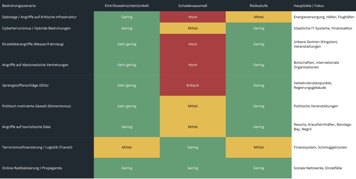 Eine mögliche indirekte Relevanz ergibt sich aus dem sogenannten Crime-Terror-Nexus, also potenziellen Überschneidungen zwischen organisierter Kriminalität und terroristischen Netzwerken, etwa im Bereich Finanzierung oder Logistik. Für Jamaika liegen jedoch keine belastbaren Hinweise auf eine systematische Verbindung dieser Art vor.