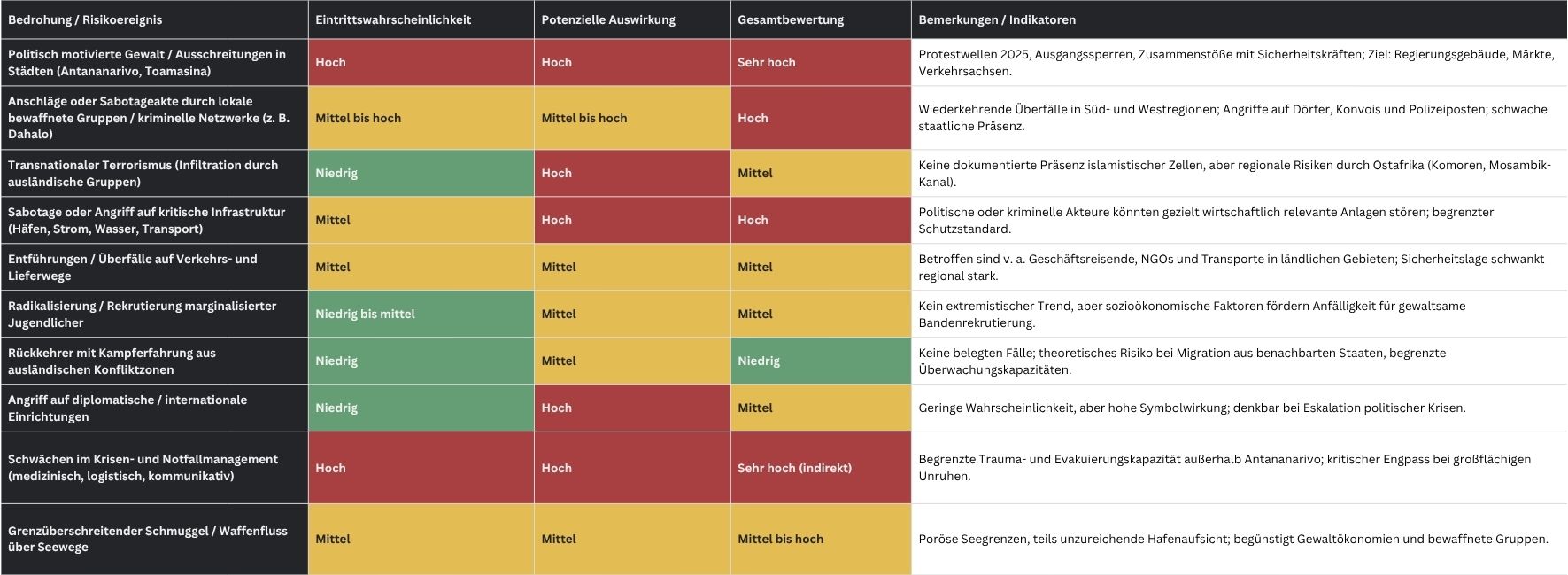 Die allgemeine Bedrohungslage in Madagaskar ist 2025 durch politische Instabilität, wachsende innenpolitische Unruhen und kriminelle Gewalt gekennzeichnet, nicht durch eine etablierte Präsenz transnationaler, islamistisch motivierter Terrornetzwerke.