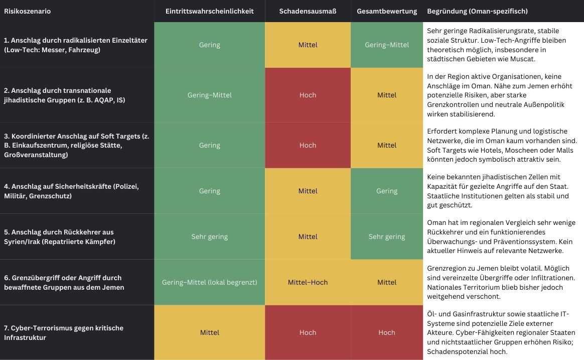 Die Bedrohungslage durch Terrorismus im Oman gilt im regionalen Vergleich als gering, was vor allem auf die innenpolitische Stabilität sowie die traditionell neutrale, diplomatisch ausgleichende Außenpolitik des Sultanats zurückzuführen ist. Oman verfolgt seit Jahrzehnten einen pragmatischen Kurs, der auf Dialog, Vermittlung und Zurückhaltung gegenüber regionalen Konflikten basiert. Diese Haltung hat dazu beigetragen, das Land aus den unmittelbaren Auseinandersetzungen im Nahen Osten herauszuhalten und ein Umfeld zu schaffen, in dem extremistisches Gedankengut kaum gesellschaftlichen Nährboden findet. Bislang sind keine terroristischen Anschläge auf omanischem Staatsgebiet registriert worden, was die Effektivität staatlicher Sicherheitsstrukturen unterstreicht.
