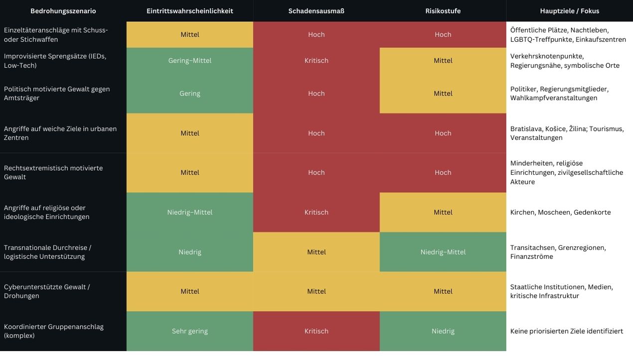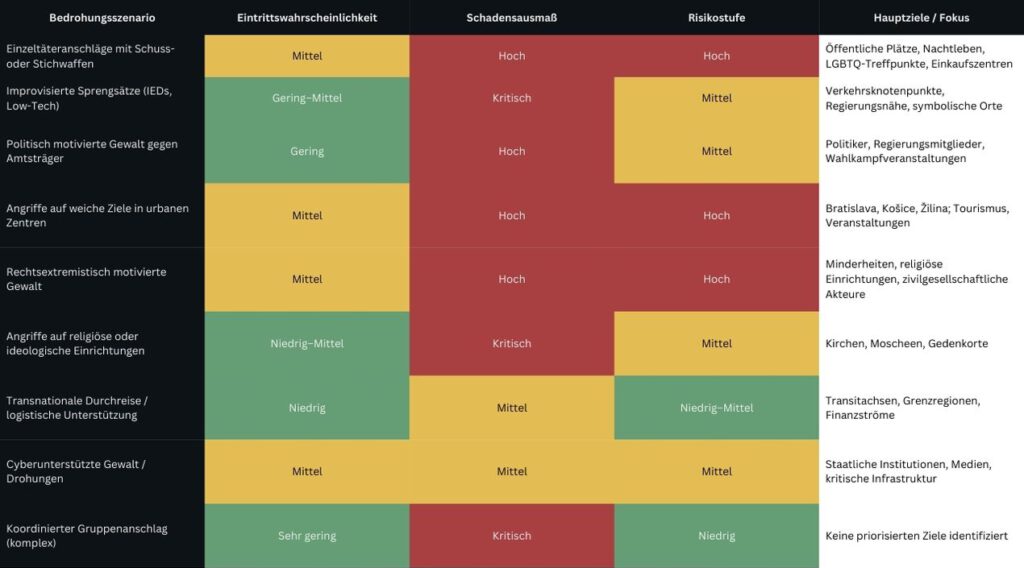 Als mögliche Tatmittel werden Schusswaffen, Messer sowie improvisierte Sprengsätze genannt, während komplexe, koordinierte Anschlagsmuster als wenig wahrscheinlich gelten. Räumlich zeigen sich Unterschiede zwischen urbanen und ländlichen Gebieten: In größeren Städten wie Bratislava, Košice oder Žilina besteht eine höhere Dichte potenzieller Zielobjekte, während ländliche Regionen geringere Zielattraktivität aufweisen, jedoch aufgrund geringerer Polizeipräsenz und höherer Anonymität andere sicherheitsrelevante Aspekte aufweisen können. Politisch motivierte Gewaltakte gegen staatliche Repräsentanten oder kritische Infrastruktur werden ebenfalls als relevantes Risikofeld benannt, wie die genannten Vorfälle belegen.