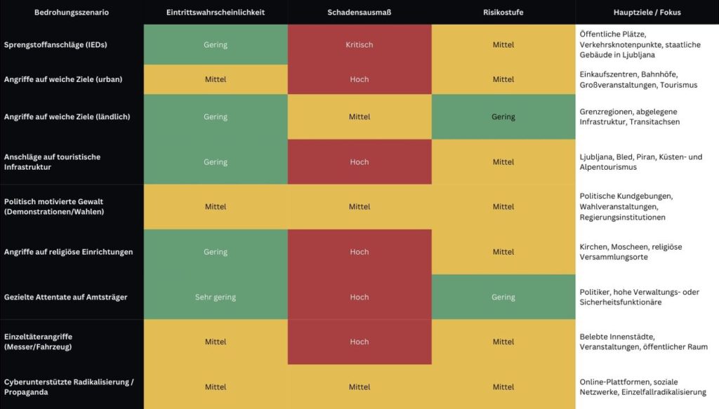 Die spezifischen Risiken konzentrieren sich auf städtische Räume mit hoher Personendichte. Besonders die Hauptstadt Ljubljana sowie weitere urbane Zentren wie Maribor oder Koper und touristische Hotspots wie Bled oder Piran gelten als relevante Bezugspunkte der Sicherheitsbehörden. Als potenzielle Zielobjekte werden sogenannte weiche Ziele definiert, darunter belebte öffentliche Plätze, Verkehrsknotenpunkte wie der Hauptbahnhof Ljubljana, Einkaufszentren, Großveranstaltungen, religiöse Einrichtungen, diplomatische Vertretungen sowie touristische Infrastruktur. Die Betrachtung potenzieller Anschlagsarten orientiert sich an europäischen Mustern und umfasst niedrigschwellige Angriffsformen durch Einzeltäter oder Kleinstgruppen, insbesondere Messerangriffe, Fahrzeugattacken, Brandstiftungen sowie in geringerem Maße Schusswaffen- oder Sprengstoffdelikte. Diese Szenarien basieren auf generischen europäischen Entwicklungen und nicht auf empirisch belegten Vorfällen in Slowenien.