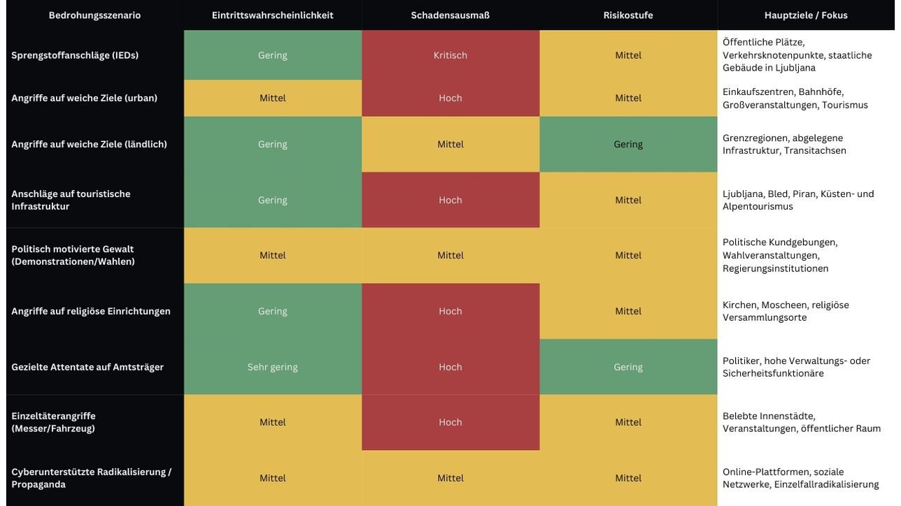 Gleichzeitig hat sich die allgemeine Bedrohungslage seit Ende 2023 im europäischen Kontext verändert. Die slowenischen Behörden führen den nationalen Terrorwarnstatus aktuell auf der Stufe „Mittel“ (Stufe 3 von 5) gemäß dem seit 2016 bestehenden fünfstufigen Terrorismus-Alarmplan, zuletzt bestätigt im März 2025. Diese Einstufung verweist auf eine potenzielle, jedoch nicht konkretisierte Anschlagsgefahr. Sie resultiert nicht aus bekannten Planungen gegen slowenische Ziele, sondern aus der globalen Sicherheitslage, insbesondere den Entwicklungen im Nahen Osten sowie den europaweiten Erfahrungen mit jihadistisch, rechts- oder linksextrem motivierten Einzeltaten.