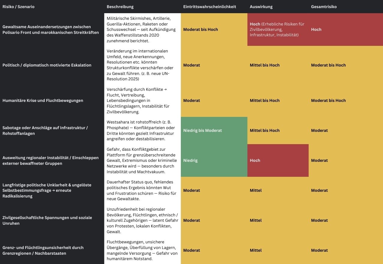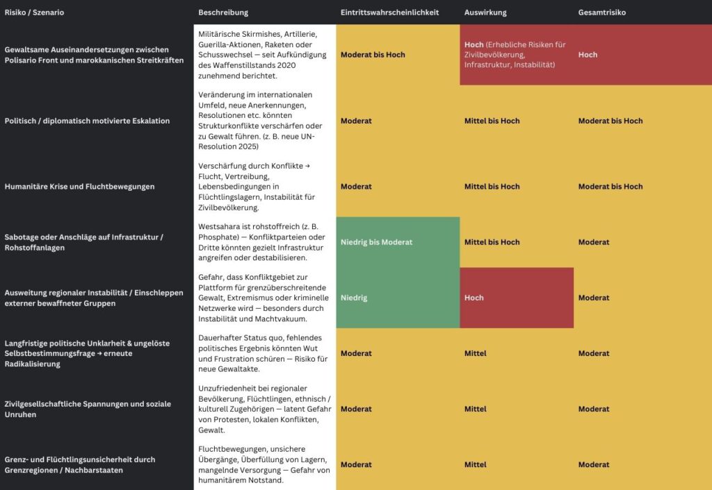 Spezifische Risiken konzentrieren sich insbesondere auf folgende Dimensionen: Erstens gelten militärische Stellungen, Polizeiposten und Verwaltungsgebäude der marokkanischen Behörden in den von Rabat kontrollierten Landesteilen als potenzielle Ziele, da sie Symbol und Instrument der umstrittenen Herrschaftsausübung sind. Zweitens können Transport- und Lieferketten, inklusive Konvois, Grenzpassagen sowie logistische Knoten (etwa entlang der „Pufferzone“ und der Übergänge Richtung Mauretanien und Algerien), im Fokus kriminell-terroristischer Mischakteure stehen, bei denen Entführungen, Überfälle oder Sprengstoffanschläge eine Rolle spielen können. Drittens besteht ein allgemeines, wenn auch schwer quantifizierbares Risiko, dass grenzüberschreitende jihadistische Gruppen in schwach kontrollierten, ländlichen und wüstenhaften Gebieten Rückzugsräume, Lager oder Durchgangsrouten nutzen, ohne dass dies zwingend in offene Angriffe auf lokale Bevölkerung oder internationale Präsenz (z. B. UN-Personal in Nachbarregionen) münden muss.